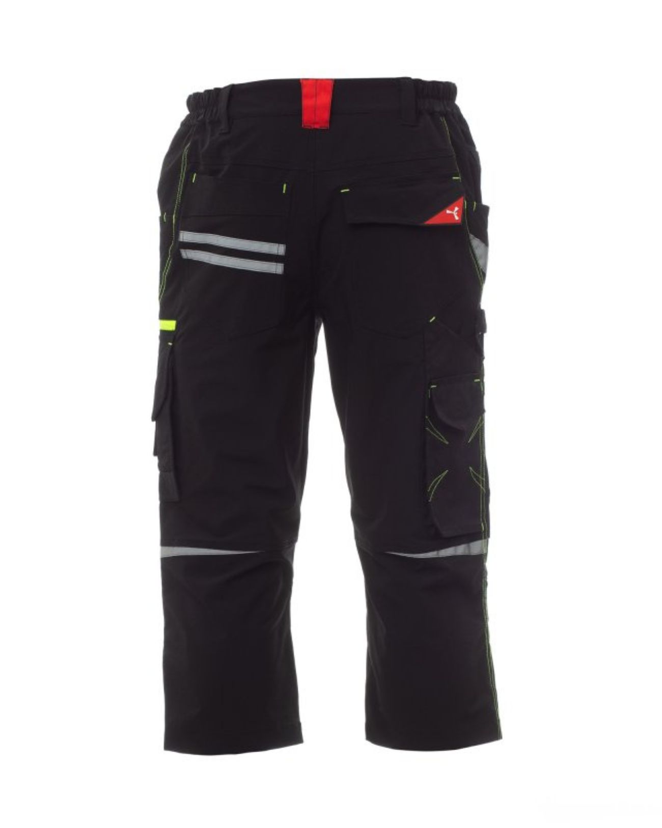 Pantaloni pirata (3/4), unisex, tessuto “4 way stretch”, con elastici laterali e passanti in vita, chiusura con zip e bottone personalizzato. Sul davanti ha due tasche arrotondate, un taschino porta monete a destra, un taschino di sicurezza chiuso con zip a sinistra. Sul fronte della gamba sinistra presenta 3 tasche: una tasca orizzontale chiusa da una zip, una tasca con patta sagomata chiusa con velcro e dotata di portabadge, una tasca piccola verticale chiusa con zip. Sul fronte della gamba destra è presente una banda retroriflettente. Entrambe le gambe sono dotate di porta ginocchiere con apertura dall'alto. Sul retro sono presenti: una tasca con pattina chiusa con velcro e una tasca senza pattina ma con 2 bande retroriflettenti, un anello porta martello (gamba destra), una tasca aperta porta metro (gamba destra) e una tasca porta-telefono con patta e velcro (gamba destra), inserti retroriflettenti all’altezza del ginocchio (entrambe le gambe). Sono presenti anche impunture laterali e travette di rinforzo a contrasto in vari punti. Le taglie (italiane) centrali 48-50-52 hanno un interno gamba di 51 cm.