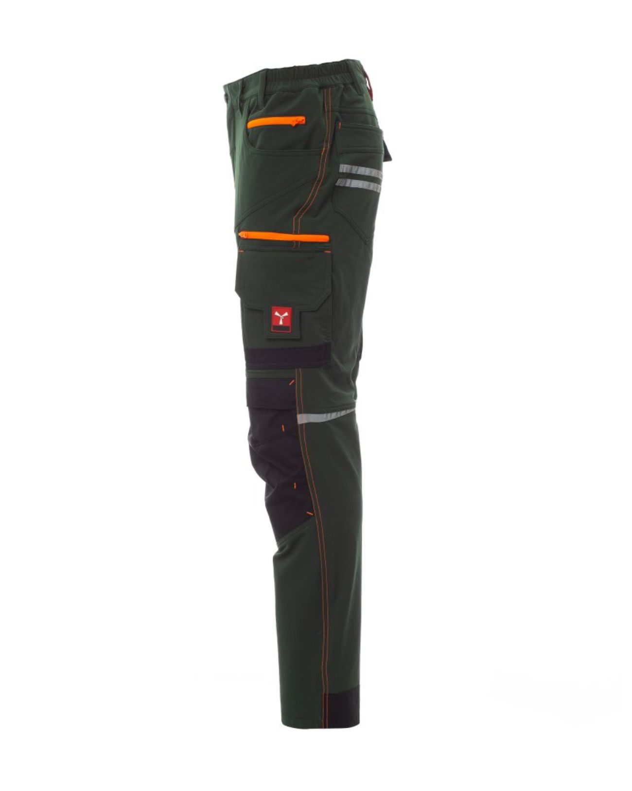 Pantalone unisex, tessuto “4 way stretch”, estivo, con elastici laterali e passanti in vita, chiusura con zip e bottone personalizzato. Sul davanti ha due tasche arrotondate, un taschino porta monete a destra, un taschino di sicurezza chiuso con zip a sinistra. Sul fronte della gamba sinistra presenta 3 tasche: una tasca orizzontale chiusa da una zip, una tasca con patta sagomata chiusa con velcro e dotata di portabadge, una tasca piccola verticale chiusa con zip. Sul fronte della gamba destra è presente una banda retroriflettente. Entrambe le gambe sono dotate di porta ginocchiere con apertura dall'alto. Sul retro sono presenti: una tasca con pattina chiusa con velcro e una tasca senza pattina ma con 2 bande retroriflettenti, un anello porta martello (gamba destra), una tasca aperta porta metro (gamba destra) e una tasca porta telefono con patta e velcro (gamba destra), inserti retroriflettenti all'altezza del ginocchio (entrambe le gambe), battitacco in tessuto a contrasto (entrambe le gambe). Sono presenti anche impunture laterali e travette di rinforzo a contrasto in vari punti. Le taglie (italiane) centrali 48-50-52 hanno un interno gamba regolare di 82 cm.
